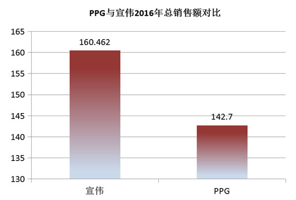 不過(guò),PPG還有機(jī)會(huì)超越宣偉,再次奪得全球涂料霸主地位。從2016財(cái)年報(bào)告來(lái)看,宣偉集團(tuán)銷售額為118.556億 美元,威士伯銷售額為41.906億美元,兩家公司合并后的銷售額約為160.462億美元;PPG工業(yè)2016 年度涂料凈銷售額為142.7億美元。宣偉與PPG涂料銷售額相差17.762億美元。