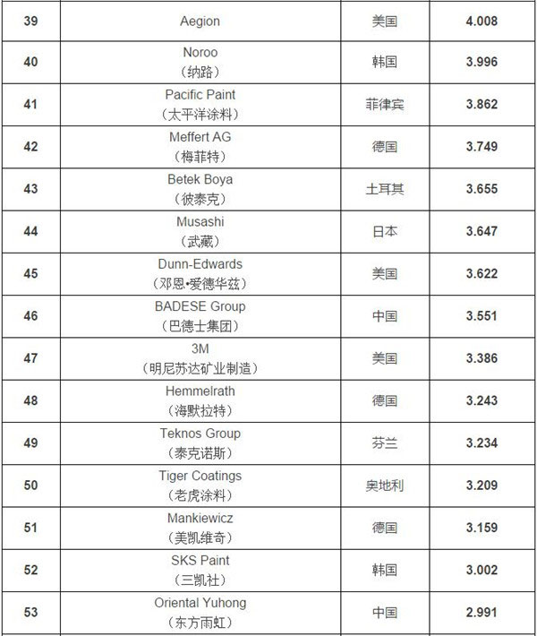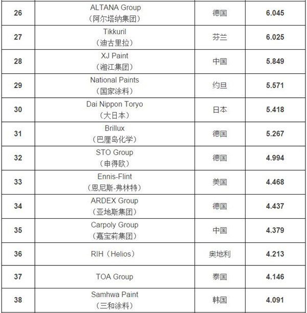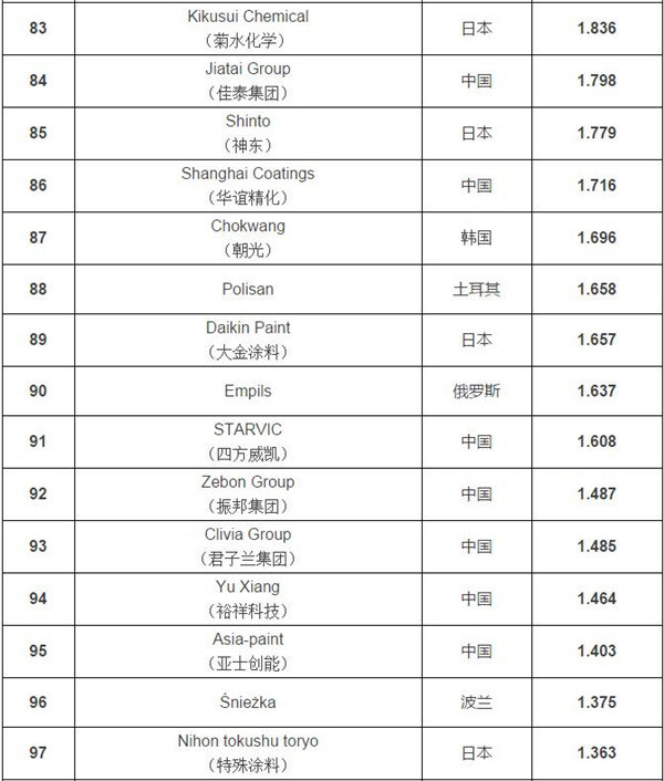 4、由于日本關(guān)西涂料株式會(huì)社于2017年3月31日才完成收購(gòu)了歐洲涂料制造商Helios集團(tuán)的所有股份。因此,Helios集團(tuán)仍繼續(xù)納本年度排行榜。